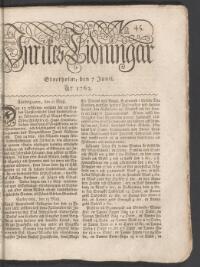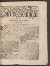 INRIKES TIDNINGAR 1762-06-07 Fritt Upphov Ingen uppgift Utgivningsår 1762 Ingår i samling Inrikes tidningar Kategori Tidningsnummer