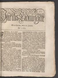 INRIKES TIDNINGAR 1762-06-17 Fritt Upphov Ingen uppgift Utgivningsår 1762 Ingår i samling Inrikes tidningar Kategori Tidningsnummer