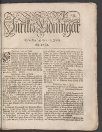 INRIKES TIDNINGAR 1762-06-28 Fritt Upphov Ingen uppgift Utgivningsår 1762 Ingår i samling Inrikes tidningar Kategori Tidningsnummer