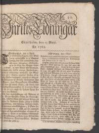 INRIKES TIDNINGAR 1762-05-10 Fritt Upphov Ingen uppgift Utgivningsår 1762 Ingår i samling Inrikes tidningar Kategori Tidningsnummer