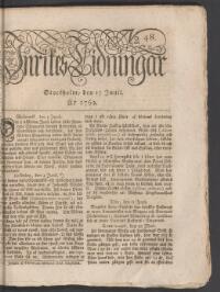 INRIKES TIDNINGAR 1762-06-03 Fritt Upphov Ingen uppgift Utgivningsår 1762 Ingår i samling Inrikes tidningar Kategori Tidningsnummer