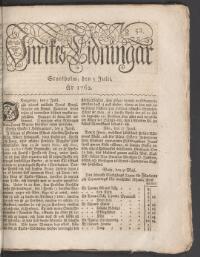 INRIKES TIDNINGAR 1762-07-01 Fritt Upphov Ingen uppgift Utgivningsår 1762 Ingår i samling Inrikes tidningar Kategori Tidningsnummer