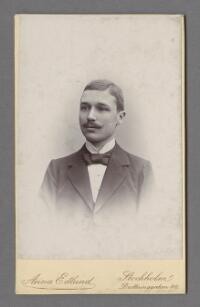 Porträtt föreställande läkaren Emil Bovin Fritt Upphov Edlund, Anna, 1852-1932 Utgivningsår 1899 Kategori BildBilderPorträttFotografier (påsiktsbilder)Visitkortsfotografier