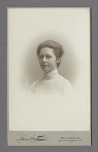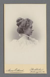 Porträtt föreställande Sigrid Warfvinge Fritt Upphov Edlund, Anna, 1852-1932 Utgivningsår 1900 Kategori BildBilderPorträttFotografier (påsiktsbilder)Visitkortsfotografier