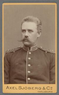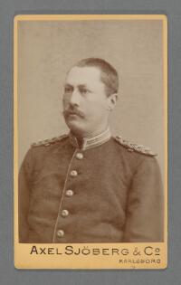 Porträtt föreställande löjtnant Gustaf Svedlund Fritt Upphov Axel Sjöberg & Co Utgivningsår 1887 Kategori BildBilderPorträttFotografier (påsiktsbilder)Visitkortsfotografier