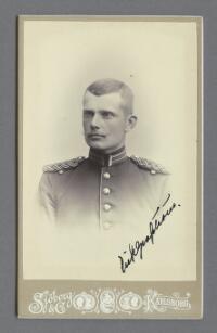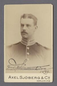 Porträtt föreställande kaptenen Gustaf von Schulzenheim iklädd militäruniform Fritt Upphov Axel Sjöberg & Co Utgivningsår 1889 Kategori BildBilderPorträttFotografier (påsiktsbilder)Visitkortsfotografier