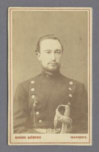 Porträtt föreställande officerare Fredrik Robson iklädd uniform Fritt Upphov Axel Sjöberg & Co Utgivningsår 1880 Kategori BildBilderPorträttFotografier (påsiktsbilder)Visitkortsfotografier