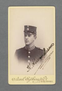 Porträtt föreställande herr K. Alexanderson iklädd uniform Fritt Upphov Axel Sjöberg & Co Utgivningsår 1880 Kategori BildBilderPorträttFotografier (påsiktsbilder)Visitkortsfotografier