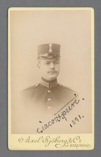 Porträtt föreställande Jacob Petré iklädd militäruniform Fritt Upphov Sjöberg, Axel, 1865-1936 Utgivningsår 1891 Kategori BildBilderPorträttFotografier (påsiktsbilder)Visitkortsfotografier