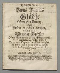 Zions barnas glädje öfwer sin konung, som hjelper de elända härligen, betraktad uti en christelig predikan öfwer evangelium på 24. söndagen efter trinit. hållen i Wånga kyrka, år 1748. Då ett nytt orgewerk derstädes inwigdes, och derföre, äfwen til samma förrättning lämpad: samt efter begäran sedermera widare utförd, och til trycket lämnad af Andr. Ol. Knös. Skara, tryckt hos direct. Herm. Arnold Moeller, kongl. gymn. priv. boktryckare, den 20. decemb. år 1749.