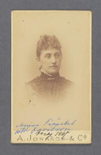 Porträtt föreställande Marina Fränckel Fritt Upphov A. Jonason & Co Utgivningsår 1887 Kategori BildBilderPorträttFotografier (påsiktsbilder)Visitkortsfotografier