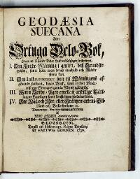 Geodæsia Suecana eller Örtuga delo-bok, hwar uti följande delar hufwudsakeligen beskrifwes, I. Om jorde-mätning i gemen, desz grundskepelser, samt huru man deras innehåld och wärde finna kan. II. Om instrumenter som til mätningens afgörande fordras, deras bruk, samt en kort berättelse om Sweriges gamla myntz gällande. III. Huru jorde-ägor emellan åtskillige låttlagare lageligen samt konsteligen fördelas böra. IV. Om råå och rör, eller gräntzemärkens tilstånd och beskaffenheter : &c. Theoretico-practice sammanskrifwen af Eric Agner Angermanno. Stockholm, tryckt uti historiogr. regni tryckerij af Hartwig Gercken. 1730