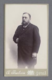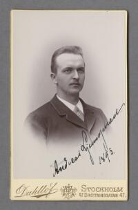 Porträtt föreställande Johan August André Fritt Upphov Marcko, Anton Ferdinand Nilsson, 1868-1930 Utgivningsår 1900 Kategori BildBilderPorträttFotografier (påsiktsbilder)Visitkortsfotografier