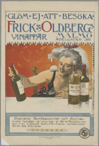 Glöm ej att besöka Frick & Oldbergs vinaffär, Malmö Fritt Upphov Andrén, Victor, 1856-1930 Utgivningsår 1896 Kategori Bild