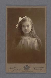 Porträtt föreställande Greta Bovin som barn Fritt Upphov Ateljer Jaeger (Fotograffirma) Utgivningsår 1900 Kategori BildBilderPorträttFotografier (påsiktsbilder)VisitkortsfotografierBarnporträtt