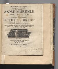 Memoriæ posthumæ, honestissimæ & laudatissimæ matronæ, Annæ Mureniæ Boëtii filiæ; viri spectatissimi prudentissimique. Dni. Petri Stigz, in Thor-Sund inspectoris solertissimi, conjugis desideratissimæ; in mundum natæ anno 1635, 28 Decembr. Denatæ verè, anno 1674, 2 Martii, ac sepulcro deniqve illatæ anno 1675, 21 Novemb. Dicavit Andreas Boman junecopensis, Sæ: Ræ: Mtis: alumnus.