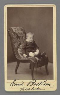 Porträtt föreställande Emil Boström som barn Fritt Upphov Sjöberg och Pettersson Utgivningsår 1870 Kategori BildBilderPorträttFotografier (påsiktsbilder)VisitkortsfotografierBarnporträtt