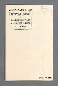 Hugo Carlbergs utställning å landstingssalen, Rådhuset Malmö Fritt Upphov Carlberg, Carl David Hugo Utgivningsår 1916 Kategori Ej skönlitteratur