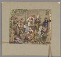 En grupp av kvinnor och män i dalarnas folkdräkt uppvisande textilier, mattor mm Fritt Upphov Dardel, Fritz von, 1817-1901 Utgivningsår 1800 Kategori BildAkvarellerBilder