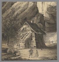 Berglandskap med timmerstuga och bondpar Fritt Upphov Ehrenström, Marianne, 1773-1867 Utgivningsår 1792 Kategori BildBilderLaveringarLandskapsbilder