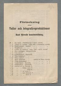 Förteckning öfver taflor och fotografireproduktioner i Knut Ekwalls konstutställning Fritt Upphov Ekwall, Knut, 1843-1912 Utgivningsår 1899 Kategori Ej skönlitteratur