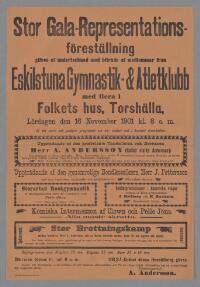Eskilstuna gymnastik- & atletklubb (Sveriges förnämsta luftgymnastik- & akrobatklubb) gifver i Eskilstuna ridhus lördagen den 1 och söndagen den 2 febr. kl. 8,15 e. m. stora föreställningar med tävlingar i atletik och brottning varvid Herr Th. Nejström skall söka erövra klubbens stora guldmedalj, Till slut stor komisk pantomim Skomakar'n från Kumla