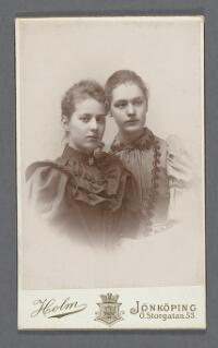 Porträtt föreställande Maria Lennman med syster Anna Sofia Fritt Upphov Holm, Hjalmar Hampus, 1860-1928 Utgivningsår 1890 Kategori BildBilderPorträttFotografier (påsiktsbilder)VisitkortsfotografierGrupporträtt