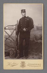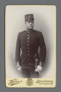 Porträtt föreställande officer Arvid Ribbing Fritt Upphov Holm, Hjalmar Hampus, 1860-1928 Utgivningsår 1895 Kategori BildBilderPorträttFotografier (påsiktsbilder)Visitkortsfotografier