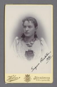 Porträtt föreställande Signe Ramsay Fritt Upphov Holm, Hjalmar Hampus, 1860-1928 Utgivningsår 1891 Kategori BildBilderPorträttFotografier (påsiktsbilder)Visitkortsfotografier