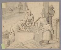 Tre tvätterskor jobbar vid ett stort tvättkar, en ung man med hatt ser på Fritt Upphov Kjellbeck, Per Johan, 1801-1841 Utgivningsår 1800 Kategori BildLaveringarBilder