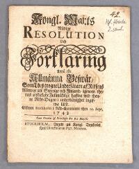 Kongl. maj:ts nådige resolution och förklaring uppå the allmänna beswär, som thesz trogne undersåtare af riksens allmoge uti Swerige och Finland, igenom theras utskickade fullmäktige hafwa wid thenne riks-dagen i underdånighet ingifwa, låtit. Gifwen Stockholm i råd-cammaren then 10. sept. 1743. Cum gratia & privilegio s:æ r:æ maj:tis. Stockholm, tryckt uti kongl. tryckeriet hos directeuren Pet. Momma.