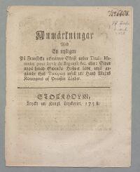 Anmärkningar wid en nyligen på fransöska utkommen skrift under titul: Memoire pour servir de reponse &c. eller: Swar uppå hwad swenska hofwet låtit utgå angående thes troupers infall uti hans maj:ts konungens af Preuszen länder. =Anon=., Stockholm, tryckt uti kongl. tryckeriet. 1758.