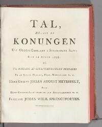 Tal, hållit af konungen uti ordens-capellet i Stockholms slott den 29 april 1799, då til riddare af seraphimer-orden dubbades en af rikets herrar ... Johan August Meyerfelt, efter herr general-lieutenanten ... Johan Wilh. Sprengtporten. (Med konungens nådigste tilstånd uplagt af svenska academien. Stockholm, tryckt i kongl. tryckeriet, MDCCXCIX.)