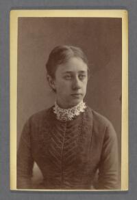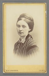 Porträtt föreställande föreståndaren Thomasin Reuterskiöld Fritt Upphov Lindgren, Berndt August, 1852-1904 Utgivningsår 1883 Kategori BildBilderPorträttFotografier (påsiktsbilder)Visitkortsfotografier
