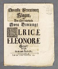 Swenska fruentimretz klagan, wid den stormägtigsta Swea drotnings Ulricæ Eleonoræ graf, förestäld af en sörjande HerdinNa. Stockholm, trykt hos Lars Salvius. 1742