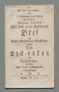 Den af Gud högt uplyste, och i sanningen in til ändan ståndaktige theologie doctoren herr And. Carl Rutströms bref til Guds församling i Stockholm: jämte des lyck-önskan på nyårs-dagen, skrifne under hans landsflygtighet, i Hamburg., Tryckt, år 1772.