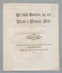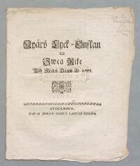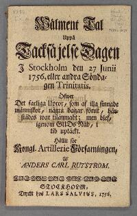 Wälment tal uppå tacksäjelse dagen i Stockholm den 27 junii 1756, eller andra söndagen trinitatis. Öfwer det farliga upror, som af illa sinnade människor, några dagar förut, härstädes war tilämnadt; men blef, igenom Guds nåd, i tid uptäckt., Hållit för kongl. artillerie församlingen, af Anders Carl Rutström. Stockholm, tryckt hos Lars Salvius, 1756.