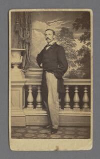 Porträtt föreställande författaren Viktor Rydberg stående framför balustrad Fritt Upphov Vogel & Dienstbach Utgivningsår 1860 Kategori BildBilderPorträttFotografier (påsiktsbilder)Visitkortsfotografier