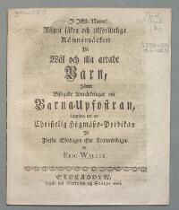 Några säkra och tilförliteliga kännemärken på wäl och illa artade barn, jämte bifogade anmärkningar om barna-upfostran, upgifna uti en christelig högmäszo-predikan på första söndagen efter trettondedagen af Eric Waller. Stockholm, tryckt, hos Nyström och Stolpe 1766.