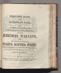Försynens hand, wid äktenskaps band, då lands-secreteraren i Sawolax och Kymmenegårds län, herr Jeremias Wallens, och mademoiselle Maria Sophia Hahr, sammanwigdes til et wälsignadt äktenskap, på Hållola prästegård, den 27 decemb. 1761. Besinnad och wördad, af J. K.