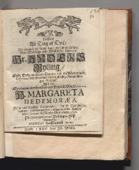 Nästan all ting af twå: det jämväl på denne dag, nogsampt ehrfarer ... hr. Anders Gylling, Gudz ordz waksame tienare och wälförordnade capellan, i ... församblingen Pargas, med ... matronan, h. Margareta Hedemoræa, då de med wanlige ceremonier... sammanwigdes i ofwanberörde sochn, den 27 januar: åhr efter Christi börd, 1697. På contrahenternes bröllops-fäst framtedde Andreas Hasselqwist junior. Trykkt i Åbo hos Jo. Wall.