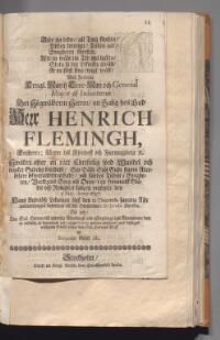 Giör tig redo, all ting flychta, döden kommer, tijden går, ewigheten förestår. Att tu wähl tin tid må lychta, sluta så din lefnadz qwäll, at tu sidst sing ewigt wäll, med fordom Kongl. May:tz troo-man och general major af infanterie den högwälborne herren, nu salig hos Gud, herr Henrich Flemingh, frijherre, herre till Isenfoff och Flemingzberg &c. Hwilken efter en rätt christelig förd wandel och mycket gudelig beredelse, sin sälle siäl Gudi sinom återlösare öfwerandtwardade, och således tijden i ewigheten, werldzens sorg och oroo, i en himmelsk glädie och roligheet saligen ombytte den 3 may, anno 1697. Hans andelöse lekamen blef den 12 decemb. samma åhr wederbörligen befordrat till sitt hwilorum i St. Jacobs kyrckia. Då och, den sal. herren till yttersta ähretienst och oförgiengeligit ähreminne, detta enfallel. är betrachtat och i någre verser widare uthfördt, med bijfogad wälment skrift öfwer den sal. herrens graf af Benjamin Greek Ab.