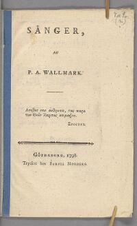 Die Sulioten, oder Die Übergabe von Suli, eine Begebenheit aus dem Anfange des Befreiung-Krieges der Griechen. Historisches Schauspiel in drey Aufzügen; aus dem Schwedischen übersetzt. Zum Erstenmal aufgeführt auf dem königl. grossen, Theater zu Stockholm, d. 11 May 1827./(P.A. Wallmark.) Stralsund, in Commission bey C. Löffler. (Stockholm, 1827. In der Ecksteinschen Buchdruckerey.)