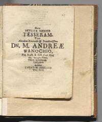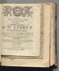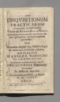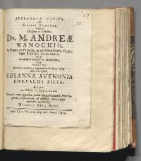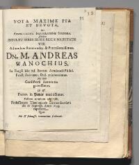 Novum professorium honorem præclarissimo at[que] doctissimo, dn. m. Andreæ Wanochio, hactenus Regiæ Academiæ Aboensis secretario, nec non phys. extraord. Nunc vero pol. & hist. Ordinario professori celeberrimo; anno M.DC.XXC.I. ipso introductionis die, qvi erat qvintus nonarum Maÿ, simplici hoc stylo inter tot plaudentium vota congratulantur fratres Germani.